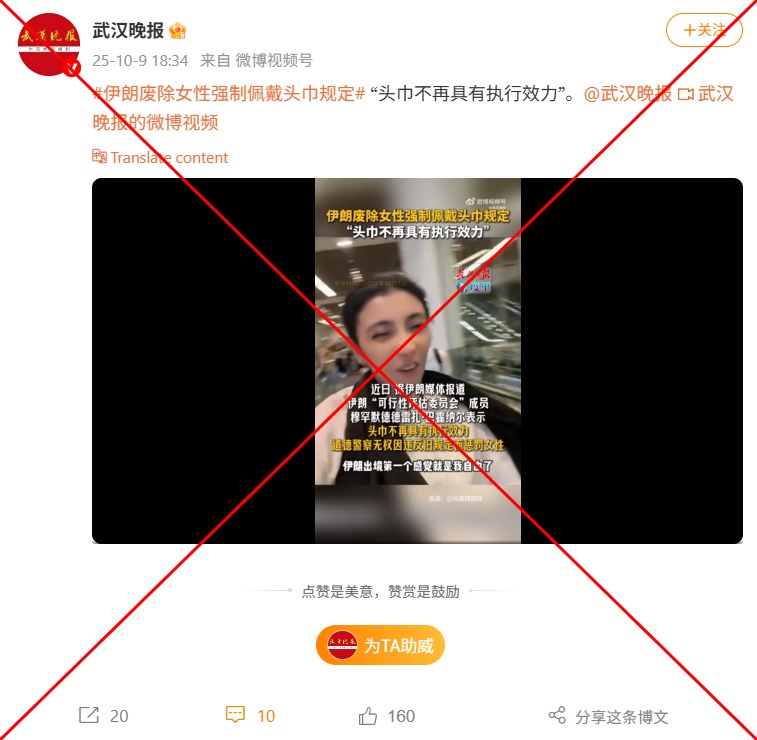 نشرت إحدى المشاركات على شبكة ويبو باللغة الصينية المبسطة عنوانًا مفاده أن إيران ألغت قاعدة الحجاب الإلزامية، وأرفق الفيديو لقطات لنساء محجبات وغير محجبات، يبدأ بمشهد امرأة تخلع الحجاب وتقول بالماندرين إن «أول إحساس بعد مغادرة إيران هو أنني حرة!» وتدّعي العناوين المصاحبة أن «العديد من النساء الإيرانيات يخلعن الحجاب ويظهرن وجوههن في الأماكن العامة».