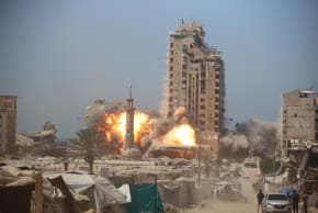 ضربة دقيقة نفذتها قوات الدفاع الإسرائيلية أدت إلى انهيار برج متعدد الطوابق استُخدم من قبل حركة حماس في مدينة غزة، بعد وقت قصير من صدور أمر إخلاء للسكان (5 سبتمبر 2025).